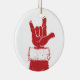 Santa's red gloved hand making the ASL sign for "I Love You".