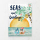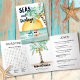 Share some fun & festive greetings with this tri-fold Christmas card featuring a beach-themed Christmas word find game, and jokes and a watercolor seascape that includes Santa, a mermaid, whale, ship, and palm tree Christmas trees. The front cover features a mermaid and Santa (with a tropical pineapple drink) in the ocean, a "Seas and Greetings" caption in nautical navy, and a palm Christmas tree. The inside features a word find game on the left, and jokes on the right. The inside center features a palm tree decorated with ornaments and lights, a "Warmest Wishes" greeting and two lines of text that you can personalize. The back features a whale in a Santa hat, seagulls and a "have a Whale of a good Christmas" greeting. Art by KL Stock