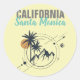 Modern word art round sticker features California in distressed grey font with Santa Monica in a modern aqua script font with geometric palms and mountains logo style graphic on pale yellow background