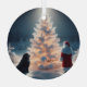 Outdoors, Santa and his Newfie, admiring the snow covered evergreen tree under a full moon.