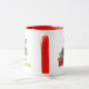 This coffee or tea mug has a jolly Santa Claus riding a red and white train with peppermint candy wheels carrying candy canes and letters to Santa with the text Merry Christmas in bright gold.