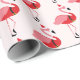 Novelty Christmas wrapping paper with a pattern of pink flamingos in Santa outfits on a pink background.