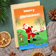 This whimsical Christmas card featuring Santa playing golf in Florida, skilfully escaping a water hazard with reindeer and Flamingo the caddy as amused spectators. Perfect for golf enthusiasts and those who appreciate a touch of holiday humour. Spread joy and laughter with this playful card! this is a Daphsam original.
