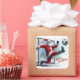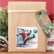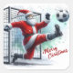 Santa Claus kicks a soccer ball towards a goal, wearing his iconic red suit and hat. The winter setting features falling snowflakes, creating a festive atmosphere. This cheerful moment captures the spirit of Christmas and fun activities.