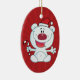 Cute white Christmas polar bear wearing a red Santa hat and a big smile is holding a red and white striped candy cane against a red starburst background.
