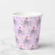 Fun Christmas paper cups with a pattern of purple octopus characters in Santa outfits on a light purple background.