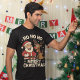 Fröhliche Cartoon-Szene mit Santa und Rentier, kräftige Creme- und Braun-Töne, retro-Comic-Text HO HO HO MERRY CHRISTMAS; ideal für Familienshirts und Geschenkartikel.