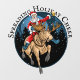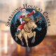 Santa Claus riding a moose at night and drinking a beer with "Spreading Holiday Cheer" text.