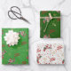 This set of wrapping paper sheets have a repeated image of Santa Claus riding a red train with peppermint candy wheels, Merry Christmas text in red, and shiny gold stars. The three different backgrounds are green with gold flecks, dark green with shining stars, and white with red polka dots.