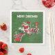 This paper napkin has Santa Claus riding a red and white Christmas train with peppermint candy wheels carrying candy canes and letters to Santa on a dark green background. Customise the Merry Christmas text with the template.