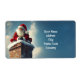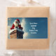 The image shows Santa Claus sitting atop a snow-covered brick chimney, dressed in his iconic red suit with white fur trim and a red hat. He is smiling warmly, his gloved hands clasped together, as snow gently falls around him. The background features a soft, wintry sky with light clouds, enhancing the festive and magical atmosphere of the scene.