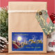 In this vintage illustration the moon is bright as Santa’s sleigh is being pulled by his trusty reindeer across the night sky.  He has a bag to of toys for all the girls and boys to deliver by Christmas morning.