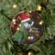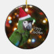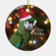 Cute Severe Macaw ornament! The parrot wears a bright red Santa hat in front of a colourful winter background. Fun for the bird lover's Xmas tree this holiday season.