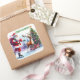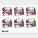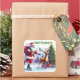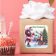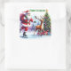 Santa Claus, dressed in his traditional red suit, joyfully skates on ice alongside a playful reindeer. They are surrounded by a vibrant Christmas tree adorned with colourful ornaments and gifts, creating a festive winter atmosphere.