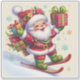 A cheerful Santa, dressed in vibrant red and green attire, glides down a snowy slope while joyfully carrying a stack of brightly wrapped gifts.
