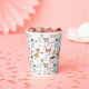 This paper cup design has whimsical Christmas elements like Snowmen, reindeer and Santas with 'Ho, Ho, Ho', 'Hello' and 'Joy' messages in a random pattern. A modern, pastel colour palette adds to the allure. Makes a perfect addition to children's Christmas party decor. Search ID559 to see other products with this design.