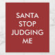 The fun saying, SANTA STOP JUDGING ME, accents this red wine label, making it perfect for gift giving or parties during the Holiday Season.