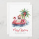 Get into the holiday spirit with this unique Christmas card featuring a relaxed Santa Claus in sunglasses lounging in a pink flamingo floaty in the ocean. Perfect for sending beachy holiday wishes, this card is ideal for anyone living in tropical places like Florida, Hawaii, or the Bahamas, or for those who simply adore the beach look. The scene includes a palm tree decorated with ornaments, gentle ocean waves, and a small island behind Santa. The card has a charming rustic watercolor style. The combination of simple fonts and script typography in red and black gives it a casual yet elegant feel. Perfect for adding a bit of surf and sand to your holiday greetings. Funny Festive Watercolor Pink Flamingo Floaty Santa Claus Tropical Beach Christmas Holiday Card.