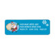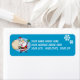 Holiday return address labels with a Santa Claus with his bag of toys on a blue background with snowflakes and white text that's easy to customise.