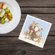 This paper napkin has a cute Santa Claus walking in the falling snow holding a lit lantern surrounded by happy children.