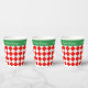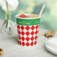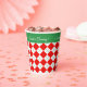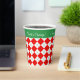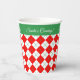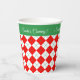 Red, white and green plaid are great for a holiday party. These paper party cups are coordinated with the paper napkins and plates titled, "Santa's Coming Reindeer Trio". Change the text to your own words to personalise your party theme. A green band at the top of the cup accents the design and is the background for the text, "Santa's Coming!".