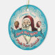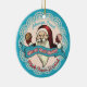 Santa with Christmas cookies, a big banner with 'North Pole Bakery' and a pretty faux lace background on this culinary Christmas ornament for your baking or sweets-themed tree or for gifting your favourite baker or pastry chef.