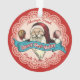Santa with Christmas cookies, a big banner with 'North Pole Bakery' and pretty faux lace backdrop on this custom-coloured culinary Christmas ornament for your bakery or sweets-themed tree or for gifting your favourite baker or pastry chef.