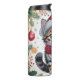The kitten is wearing a classic red Santa hat and a snugly wrapped red knitted scarf. It is framed by a highly detailed border composed of evergreen pine branches, holly leaves, red berries, and classic red ornaments with snowflake designs. The background is a warm, neutral tone with light hints of snow and decorative string lights. The overall aesthetic is nostalgic, festive, and radiates sweet holiday cheer.
