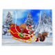 A cute little squirrel in a Santa Claus costume stands up in snow sled and hands out a large acorn to an excited little squirrel with his Christmas stocking held out for this wonderful gift.