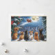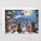 In this enchanting winter scene, a group of dogs and cats gather together, their eyes filled with wonder as they watch Santa Claus's sleigh fly across the moonlit sky. The snow-covered trees and bright moonlight create a magical atmosphere, capturing the warmth and festive spirit of Christmas. Perfect for a dog groomer or vet clinic.