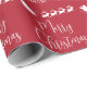 Festive red wrapping paper featuring a silhouette of reindeers flying Santa's sleigh through the air and "Merry Christmas" in a stylish white script.