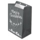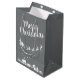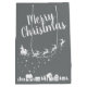 This elegant silver-grey Christmas gift bag features the silhouette of Santa's sleigh with his reindeers, flying above the houses in a trail of stars.