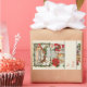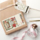 This is a lovely, vintage-inspired Christmas sticker with a soft, textured background and a string attached at the top. The design is layered, featuring a snowy village scene at the top with a horse-drawn sleigh full of children, all framed by a holly and berry wreath. Below this, there's a separate illustration showing Santa Claus standing next to a large poinsettia and two reindeer heads. The very bottom border includes golden bells and more holly. The lower half of the tag is left blank with clear lines marked "To:" and "From:" for writing gift details.