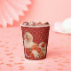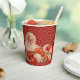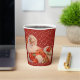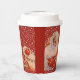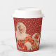 Holiday paper cup with white snowflakes on red background and Santa Claus with sleigh bells.