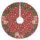 Christmas tree skirt in red with a Jolly Santa Claus, seasonal holly and berries and white snowflakes.