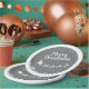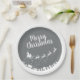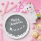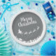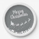 These elegant silver-grey Christmas paper plates feature the silhouette of Santa's sleigh with his reindeers, flying above the houses in a trail of stars