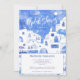 A modern watercolor painting of the picturesque town of Oia on the Greek island of Santorini to celebrate with a touch of elegance and beauty. Inspired by the stunning vistas of the island, these invitations feature a mesmerising watercolor painting of Oia in dreamy blue and white hues. Original art by Nic Squirrell.