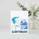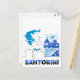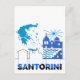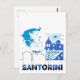 The image depicts a stylised representation of Santorini, a Greek island known for its stunning white-washed villages and breathtaking sunsets. The image features a blue outline of the island of Greece, with a prominent focus on Santorini. A stylised image of a traditional Santorini church with a cross atop its dome is featured, along with a depiction of the iconic blue and white architecture. The word "SANTORINI" is displayed in bold black letters, partially obscured by blue and white waves, symbolising the Aegean Sea surrounding the island. The overall image is a simplified and graphic representation that evokes a sense of the island's beauty and charm.