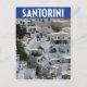 Greek island architecture on Santorini, Greece with a photo of a hillside of whitewashed walls on homes and businesses. The word Santorini in deco font at top in white on blue background.