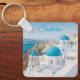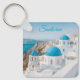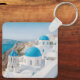 Santorini scene featuring iconic blue-domed churches and whitewashed buildings.