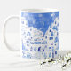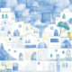 Watercolor blue and white townscape painting based on the Greek island of Santorini.