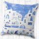 Watercolor blue and white townscape painting based on the Greek island of Santorini.