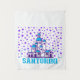 This image depicts a cartoon illustration of the iconic white-washed buildings of Santorini, Greece. The houses are clustered together and feature blue accents, reflecting the traditional architecture of the island. The background is filled with a scattering of purple stars, creating a whimsical and playful atmosphere. The word "SANTORINI" is written in bold, blue letters at the bottom of the image, further emphasizing the theme. This image is a colourful and cheerful representation of the beautiful and popular tourist destination.