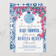 Mediterranean Greek musical bougainvillea-inspired Dancing Queen baby shower invitation measures 5x7 inches Indulge in the charm of the Mediterranean with the Mamma Mia-themed baby shower collection! Celebrate your little one's arrival amidst the serene hues of blue and white tiling reminiscent of the Santorini seaside. The invitations are made with playful elegance and pink bougainvillea, while the signs and decor are colourful and beautifully highlight the baby shower celebration. #zazzlemade