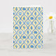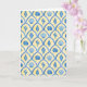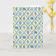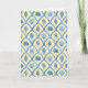 This greeting card features a pattern of blue watercolor painted shells against a yellow background.