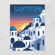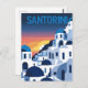 This postcard captures the serene beauty of Santorini, Greece. The illustration highlights the iconic blue-domed churches and whitewashed villages clinging to the cliffside, with the sun setting over the Aegean Sea in the background. It's a picturesque and elegant design, perfect for sharing the beauty of this famous Greek island.