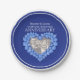 Sapphire wedding anniversary party disposable paper plates. Great to add a personalised touch to special sapphire anniversary parties, dinner parties and informal gatherings. Personalise with your happy couples names and photo in the sapphire heart effect photo frame. Blue sapphire heart effect art and design by Sarah Trett.