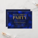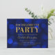 Chic bachelorette party invitation featuring the words "Bachelorette Party" in faux gold foil against a sapphire blue bokeh lights pattern background. Invitation has a blue colour background back side.