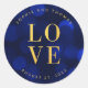 Elegant wedding sticker featuring the words "love" in faux gold foil against a sapphire blue bokeh lights pattern background.