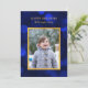 This photo holiday card features your photo and the words "Happy Holidays" in faux gold foil against a sapphire blue bokeh lights pattern background. Card has a blue background back side.